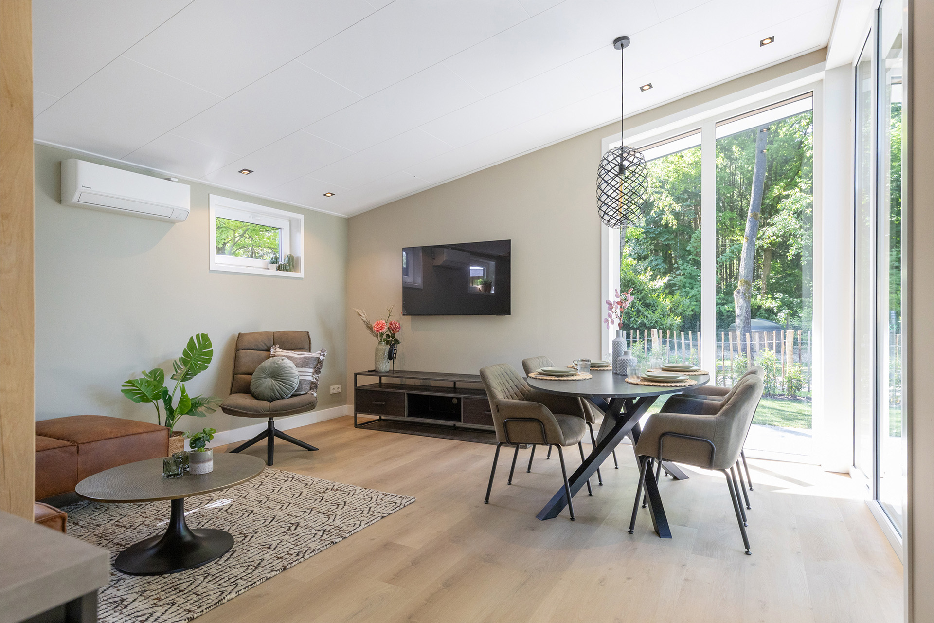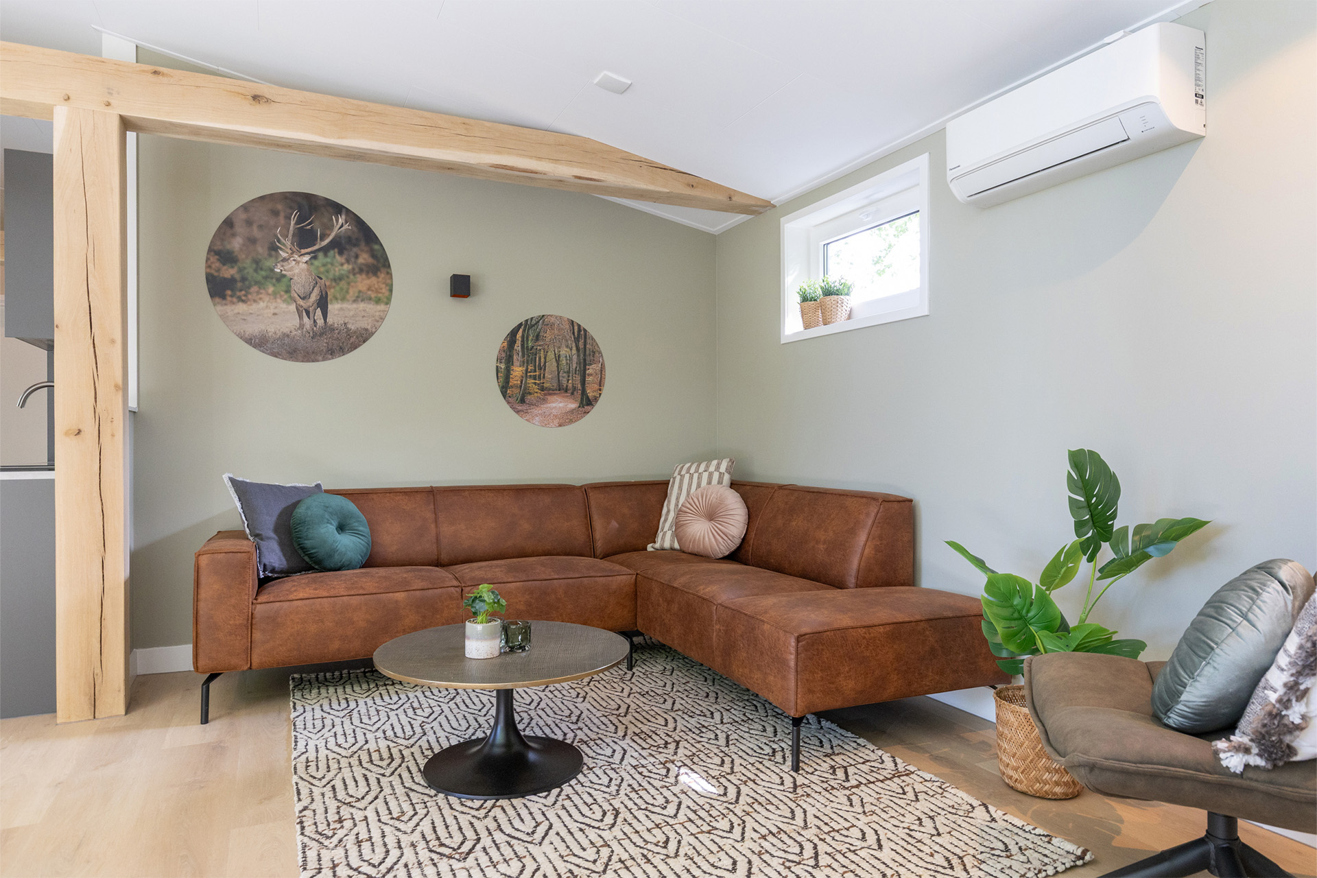 Ons 60m² chalet staat op een royaal perceel van 320m². Daardoor heb je meer dan genoeg ruimte voor het hele gezin. Binnen vind je een ruime woonkamer waar iedereen samenkomt, een complete keuken waar je alles aantreft wat je nodig hebt en twee comfortabele slaapkamers voor een goede nachtrust. Handig: er is een inloopkast waar alle vakantie-rommel verdwijnt en een luxe badkamer. Plus airco voor warme dagen en verwarming als het frisser is.